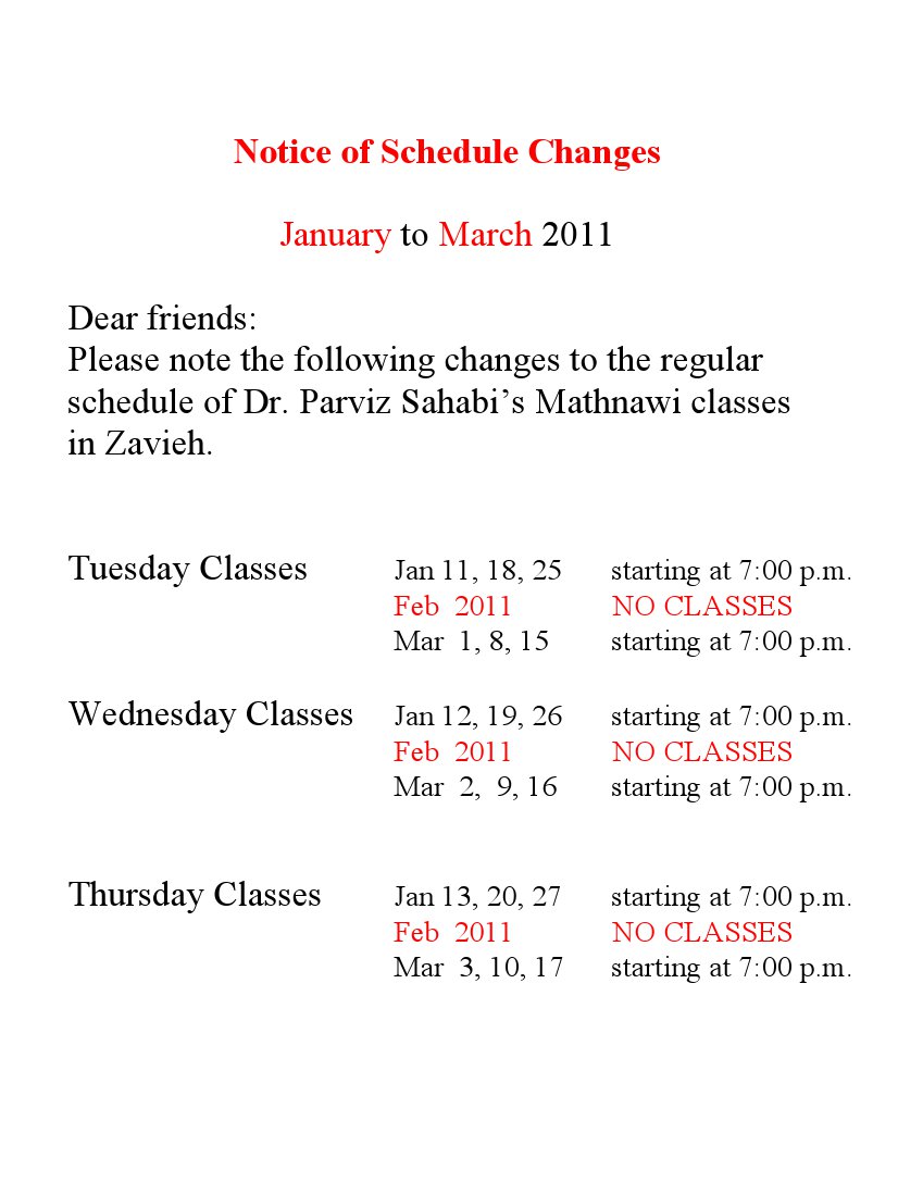 2010-12-31 Notice of Schedule Changes: January to March 2011