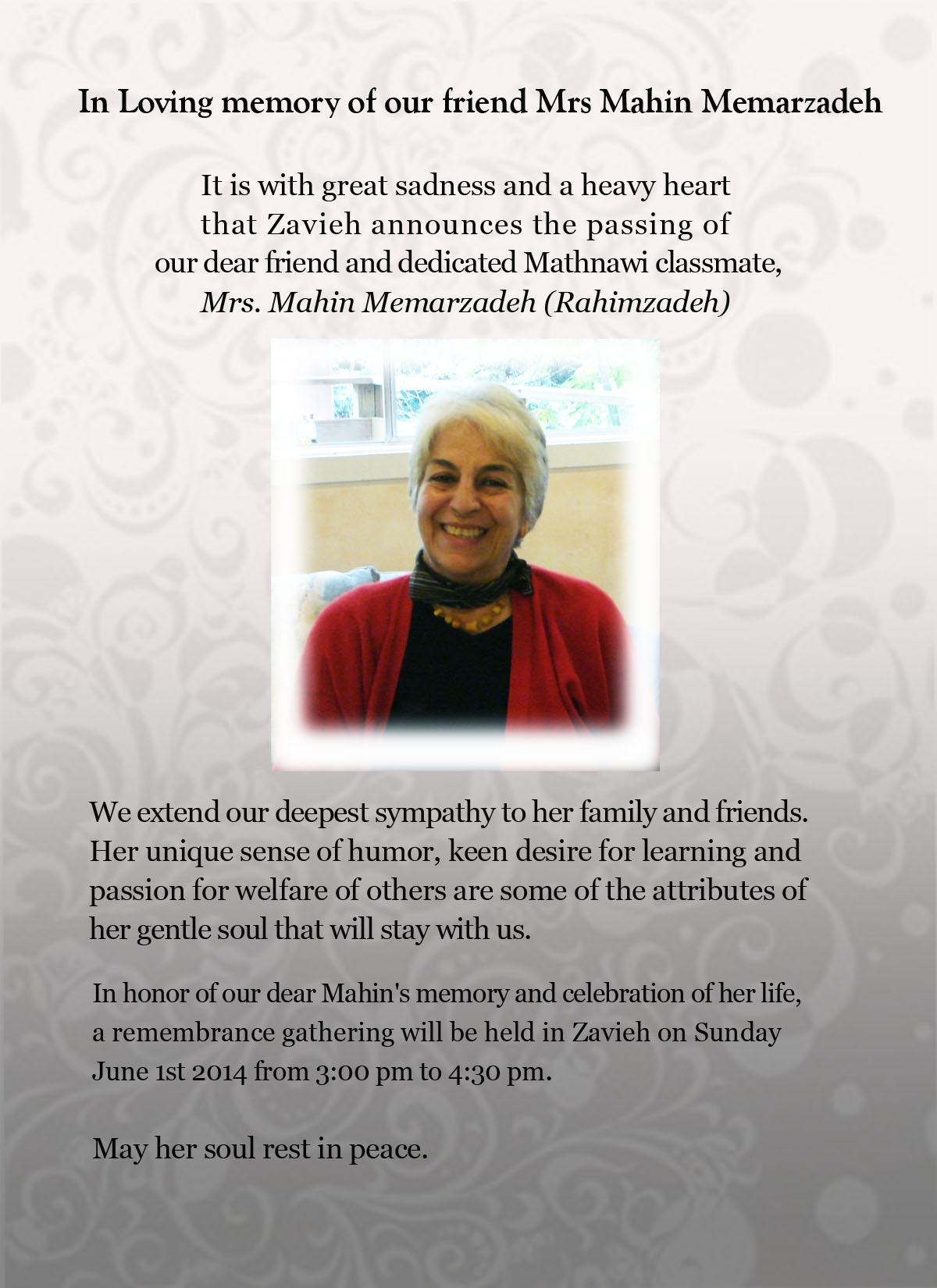 2014-05-29 In Loving memory of our friend Mrs. Mahin Memarzadeh